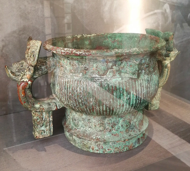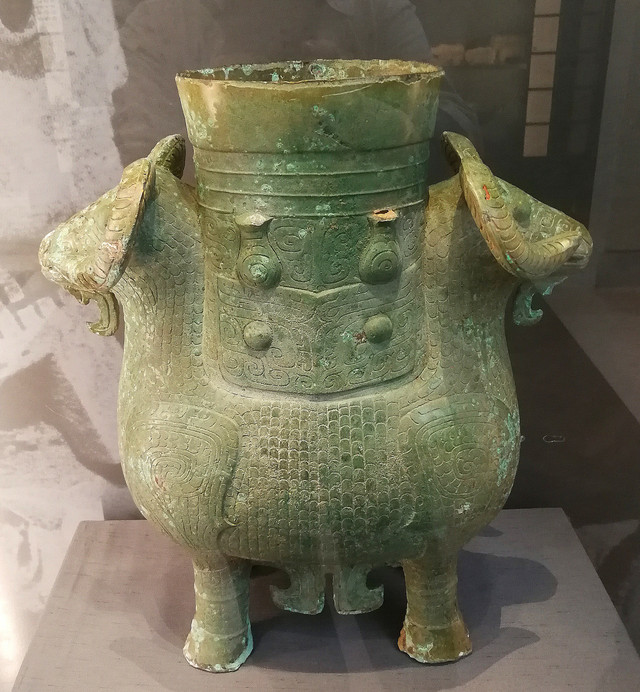 双羊尊:商朝,公元前13-12世纪。1860年“火烧圆明园”后被掠夺并流失海外。这件仪式用的青铜酒器(尊)是由两头公羊支撑的坛子。羊角自由弯曲的公羊比饕餮或怪物的脸部更为逼真和形象。在这件青铜尊上有一只饕餮,它位于这件器皿的颈部下方。饕餮的眼睛和角清晰可见,但其他面部特征只是用一些线条描绘。
