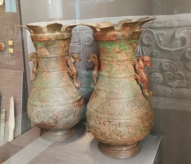 青铜壶:东周,公元前5世纪。这对壶是在山西省侯马的晋国铸造厂制造的,在壶盖的下边缘,即花瓣壶顶的下方都有同样的铭文。铭文记载着公元前482年晋国和吴国会晤时,晋国大臣赵孟铸造了此壶。在这次会晤中,两国力图签订合约,或结盟。这对青铜壶上的纹饰是一样的。每尊壶的壶身上都有四只饕餮,或四张怪物的脸。这样的设计很有创意,在粘土上刻出花纹印版,并用浮雕装饰。八张脸的模具部分是用单独的花纹印版做成的。