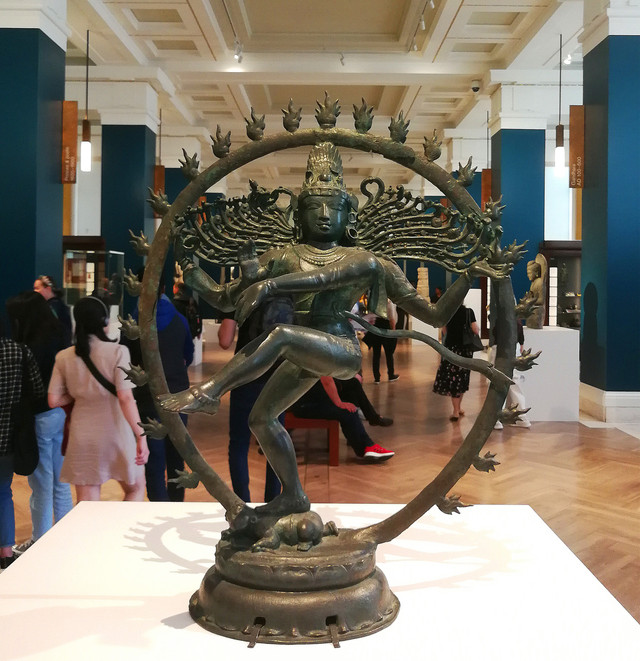 印度湿婆神雕塑:湿婆(Shiva)不仅是印度教的毁灭之神,也是舞蹈之神。湿婆神在火圈中跳舞,象征着每一个宇宙周期的开始与结束。印度南部泰米尔语区的奇丹巴拉姆寺(Chidambaram Temple)特别记录了这个关于湿婆的传说。雕塑制作中的脱蜡铸造工艺在朱罗王国时期(Chola period,公元8-13世纪)被磨炼至最完善。