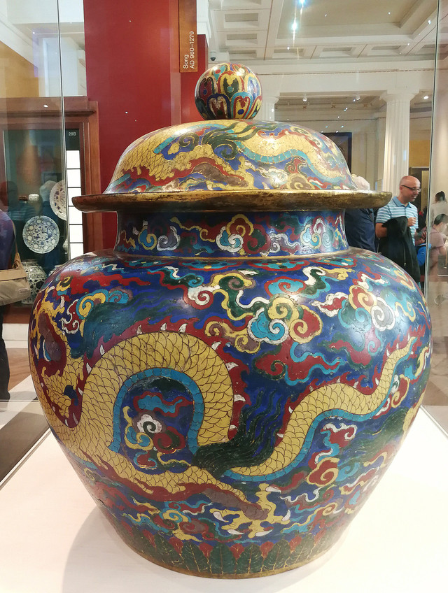 景泰蓝龙纹大盖罐:明宣德年间,高62厘米。此宣德大罐用彩强烈,尤其使用了景泰蓝罕用的黑彩,观之有厚重之感;其红彩色重,较一般红色深沉,配上大面积黄彩,让景泰蓝的蓝色基调反而不甚显现。龙纹凶猛,五爪如风车旋转,双目圆睁,张口露齿,一副大明宣德之气势。尤为重要的是口沿处有“大明宣德年制”和“御用监造”两处内外重复款识,罐内又重复镌刻一遍,表明了此罐为宣德皇帝独享,可见当年皇帝也是酷爱此物。