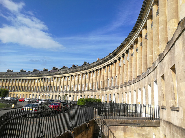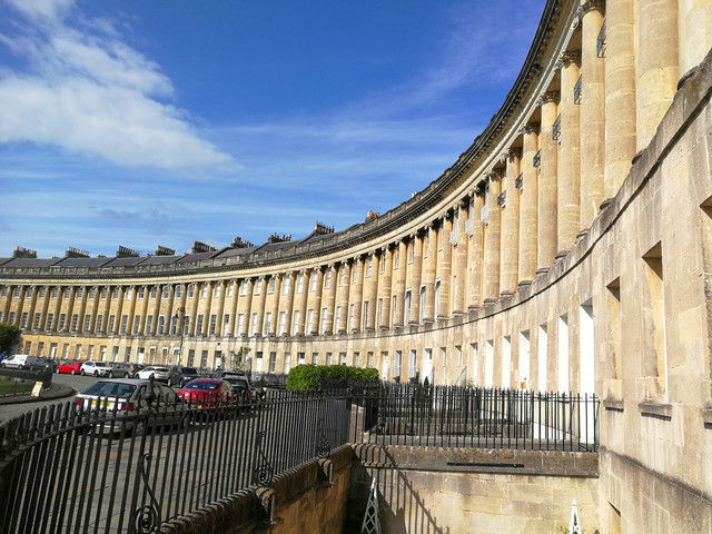 皇家新月楼是巴斯最气势辉煌的建筑,建立于1767-1775年,由连体的30幢楼与114根圆柱组成。新月楼的道路与房屋排列成新月弧形,高雅贵族式的曲线令人沉醉于建筑艺术的美,门前的大片草坪也是野餐休闲的好地方。