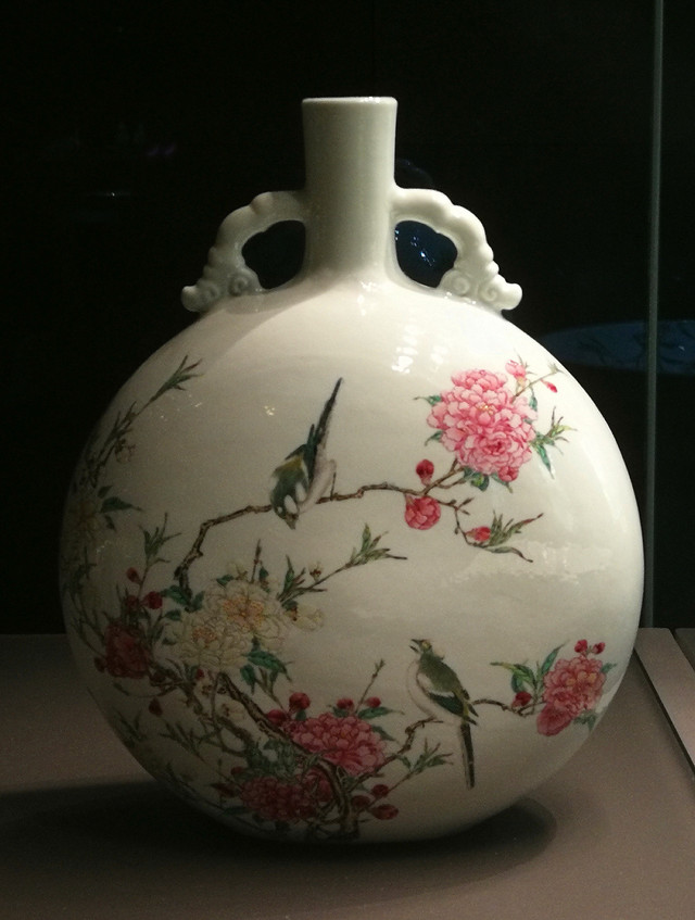 粉彩花鸟扁壶:清雍正年间,高29.3厘米。这件扁壶以温和的粉彩、写实的画法,注重表现花卉的颜色盈泽和阴阳向背以及飞鸟羽翎的质感和色彩变化,整幅画面有点儿像苏州评弹,浅吟低唱,余音绕梁,非常优美;并以花枝上的两只白头翁,表达了“白头富贵”的美好愿望。粉彩是中国陶瓷史上最后诞生的一个主要品种,它的出现打破了数百年以来青花的霸主地位。