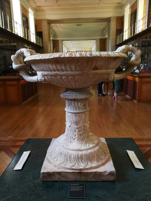 启蒙运动馆:又称“国王图书馆”,曾经用于收藏英国国王乔治三世的7万多册私人藏书以及大量的硬币、印章。1998年这些书被移至英国国家图书馆之后,这个图书馆就空了出来。2003年经过重新装修,变成了一个以启蒙为主题的展览馆。启蒙馆两侧是通达顶棚的书柜,书柜前摆有许多雕塑,可能来自世界各地。皮拉内西花瓶:这件花瓶是新古典主义的代表。艺术家通过一些碎片加自己的想象来完成艺术品,并卖给有钱人…狮子腿,公牛图以及摘葡萄都是原作,剩下的是作者自行创作的。他们会参观古 罗马 遗址,并带着艺术品回去。