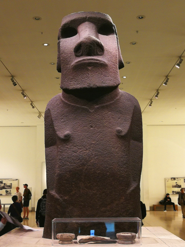 摩艾石像:大英博物馆最受欢迎的展品之一。这尊来自美洲复活节岛的石像高2.42米,宽96厘米,直径47厘米的雕像因其突出的眉毛、深邃的眼睛,恰到好处的大小,以及背后的故事,吸引着来自世界各地的游客。