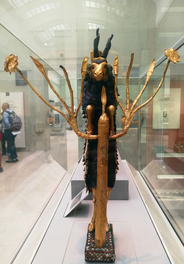 灌木丛中的公羊:此物品发现于伊拉克南部;制作于公元前2600年,在伊拉克南部王家墓地出土,因为受圣经典故影响,将其命名为“灌木丛中的公羊”;珠光宝气的公羊用了4600年前最时髦、最贵重的“金、银、青金石、铜、贝壳及红石灰石制作”。双足搭在灌木上歇息的直立公羊形象,是中东艺术中常见表现主题。