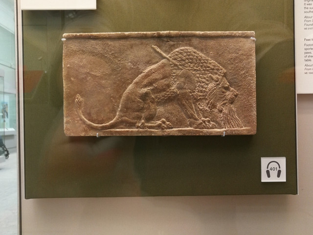 巨型人面狮身有翅雕像:原位于通往亚述(今伊拉克北部)的阿淑尔纳西尔帕王二世(King Ashurnasirpal II)王座宫殿的入口两侧。它们有五条腿,因为它们是被设计为从正面或侧面观看的。
