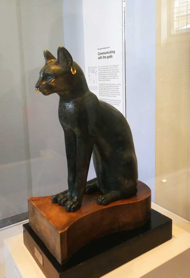 埃及猫神像雕像:这是一只猫,猫身为铜,但配以金耳环和鼻环,脖子上戴着银质护身符。古埃及传说中贝斯特女神的化身,他们相信诸神会化作猫形现身,因此,在古埃及人的心目中的地位是很高的。
