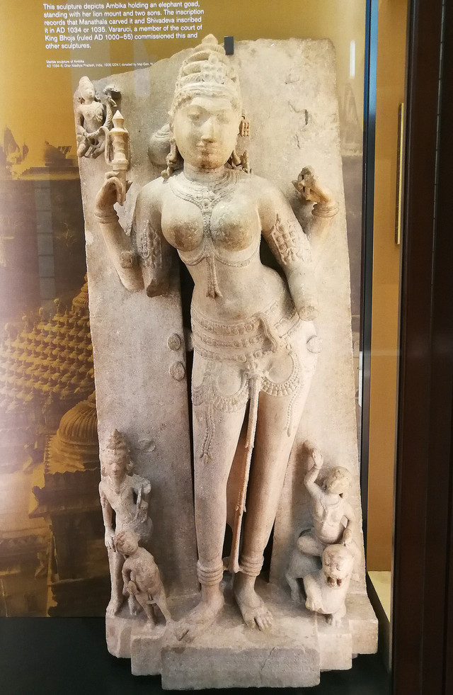 药叉女“安比卡”像:印度帕拉玛拉王朝时期,1034年。129×59×27厘米,重约250千克。高浮雕,底座边缘呈阶梯状,背后刻有铭文。安比卡的形象本有四臂,这里两臂已毁,余下两臂,一手持驯象刺棒,另一手似是握着套索的一部分。
