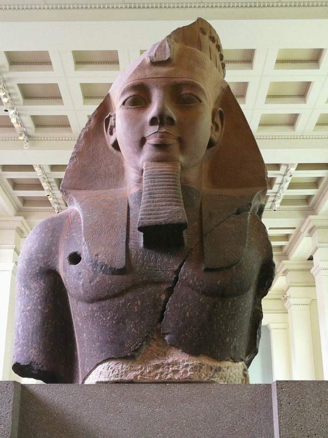 拉美西斯二世的雕像:质地为花岗岩,高2.6米,重7.2吨。右臂的圆孔据说是拿破仑时期的法国人凿的,试图将其盗走,未遂。它来自于埃及底比斯的拉美西斯神庙。在统治埃及的众多法老中,第十九王朝的拉美西斯二世是最为人熟知的一位法老,他在位时间长达67年,正是在他的统治期间,古埃及文明达到了巅峰。这座雕像堪称古埃及雕塑中的“最美雕像”。