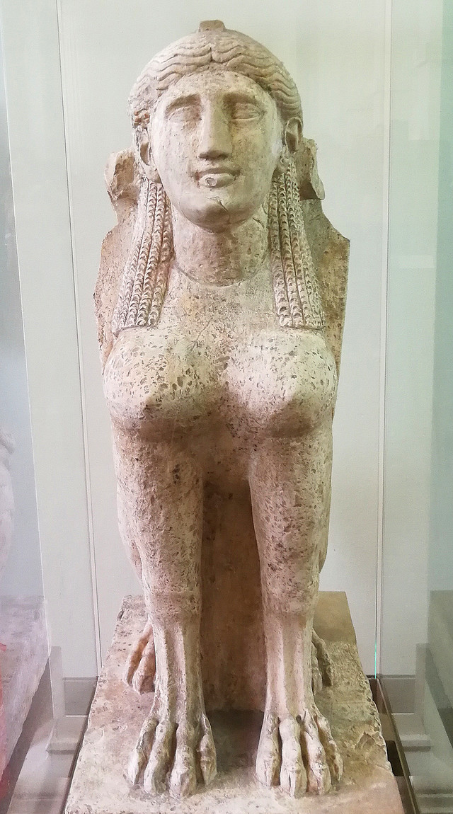 女性斯芬克斯。制作于公元2世纪罗马时期的石雕像,公元1604年来自埃及。这是希腊神话中的斯芬克斯,曾经守护着埃及的一个希腊居民的坟墓。希腊神话中的斯芬克斯是狮身人面像,有一个女人的头,一对鸟的翅膀,一个狮子的身子,还有一条蛇尾。相比之下,埃及法老的狮身人面像是王权的象征。