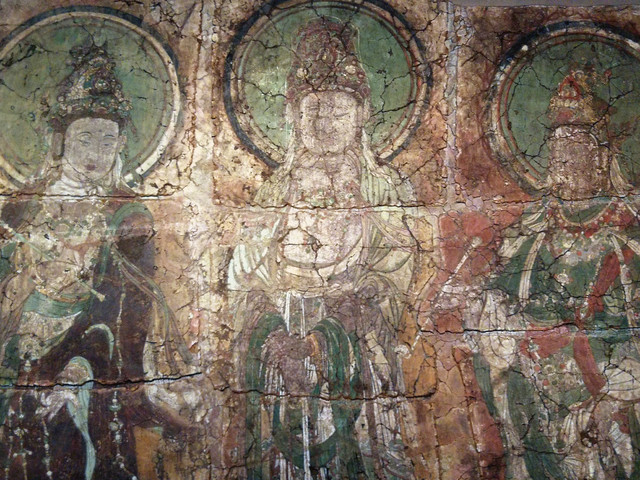 敦煌壁画:在中国厅中央墙上有几十平方米的敦煌壁画,其割痕虽犹可见,却难掩其久远的鲜丽及三位“浓丽丰肥”菩萨的雍容华贵。