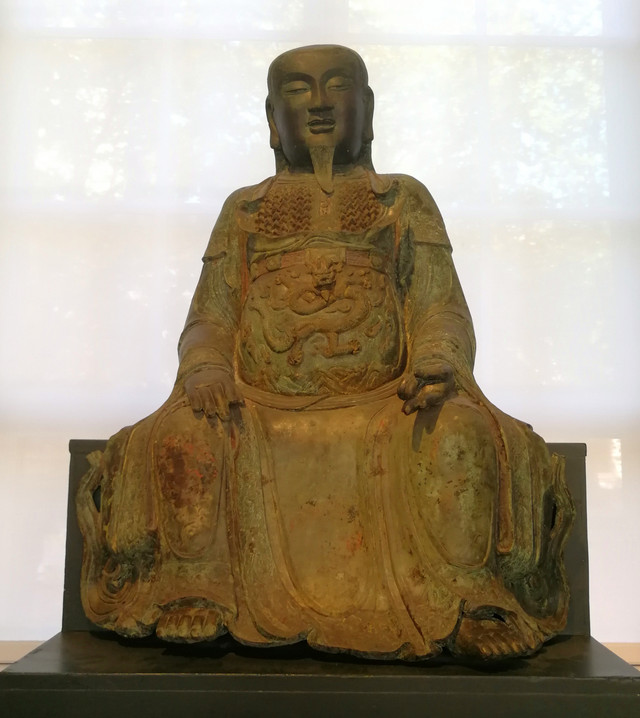 铜铸真武像:这尊真武像是现存的最大的铜铸真武像之一。真武又称玄天上帝,元圣仁威玄天上帝。真武大帝,长须,披发,身着铠甲战袍,战袍正面有龙纹装饰,他左手施真武印,即无名指和中指向前伸出。整体为铜制,原有鎏金、彩漆装饰。