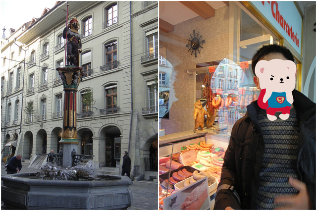 伯尔尼的德语含义:熊,有熊的地方。市内的雕塑是: 穿盔甲的熊,香肠店的木雕:站立的熊