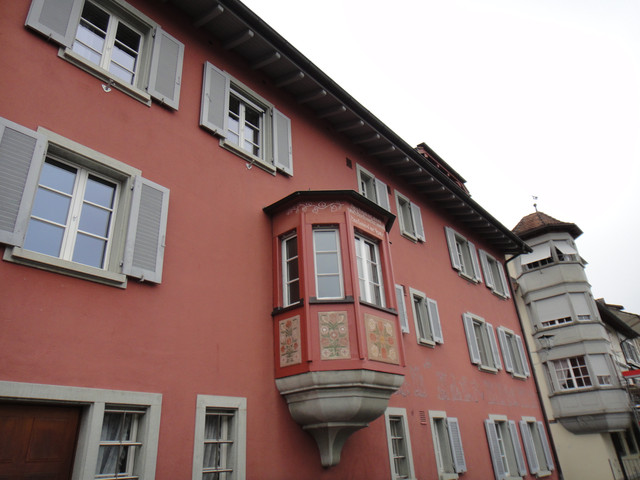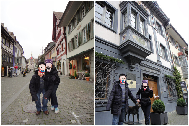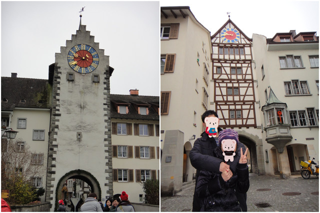 团游大巴一早就把大家,从苏黎世运到施泰因小镇,开始小镇的自由逛街。小镇入口所在楼,两面都有钟,瑞士果然是钟表王国