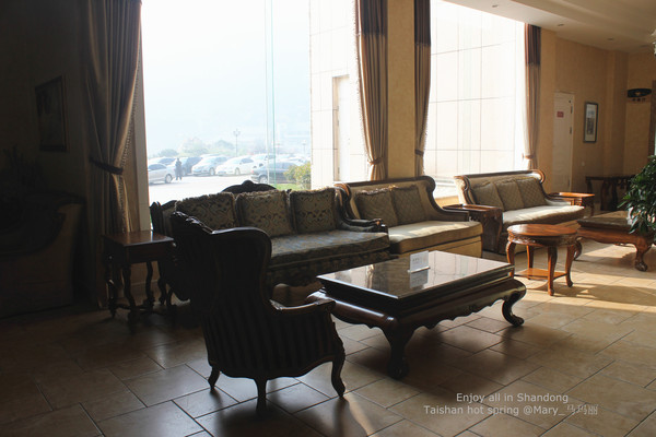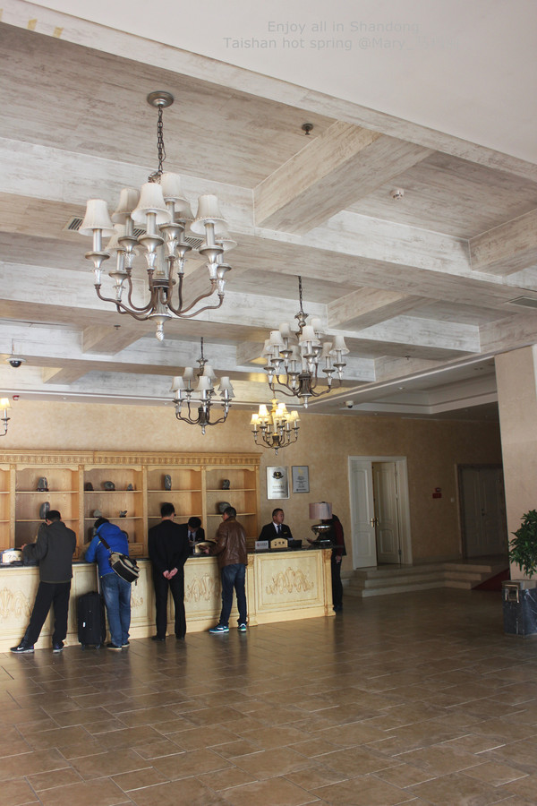 酒店CHECK IN 在1楼大堂吧。这家温泉城拥有119间客房 ,客房面积居泰安众多酒店前茅之列。