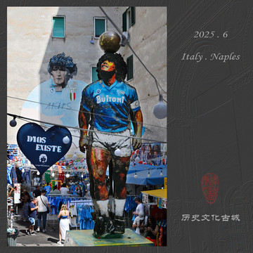 对于看意甲长大的70后,提起那不勒斯先想到马拉多纳,而在那不勒斯,马拉多纳更是平民化的神。从1984到1991年马拉多纳加盟那不勒斯俱乐部的七年,让一支刚升级的球队两夺意甲冠军,那不勒斯人见证并拥有了球王的巅峰时期。今年那不勒斯队又获得意甲冠军,最近三年来两夺桂冠,足球热潮在这里长盛不衰,街巷挂满蓝白丝带、球队旗帜和马拉多纳画像,跟马拉多纳相关的足球周边也是最有特色的旅游纪念品。有一幅马拉多纳壁画,在马拉多纳去世后成为了著名的旅游打卡地,壁画上脸的位置正好是一扇窗户,据说在那不勒斯夺冠的时候才会打开。