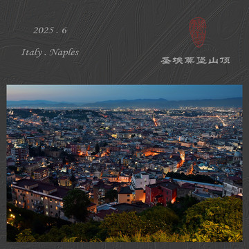 圣埃莫堡建于十四世纪,六角星型的外观,是用于军事防御和战略监控的真正城堡,位于沃梅罗山制高点,所以这里是俯瞰那不勒斯城区的最佳观景点。那不勒斯的城市夜景曾是旧世界三大夜景之一,不过六月份天黑的很晚,九点才华灯初上。在这里眺望古老的那不勒斯,在夕阳下散发着红色的余韵,现代建筑并不多,围绕在火车站附近如鹤立鸡群,更多是连绵杂乱的古民居,教堂的圆形拱顶点缀期间,天空从瓦蓝到橙红渐变,高远辽阔,飞翔着海鸥和飞机。入夜,灯光逐渐亮起,起初如稀疏星火,又变成密集星河,在大地上铺洒开去,那不勒斯的夜景迷离又浪漫。