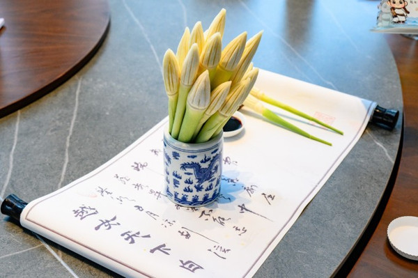 这一道“越女天下白”出自杜甫的《壮游》,就是把新鲜的茭白给打造出了一个十分有文化的造型,这最原生态的新鲜食材直接蘸上酱油或其它佐料,好吃的也非常直白。
