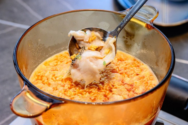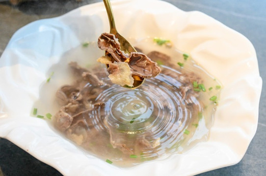 第一道菜是“茶炉天姥客”,出自温庭筠的《宿一公精舍》,说是功夫茶,里面的主料还有鲍鱼和羊肚菌,里脊肉等,这个汤水的味道那叫一个鲜美,还可以滋阴补肾、补中益气。