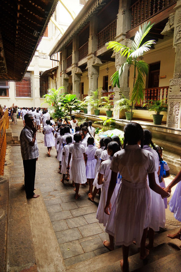佛牙寺内景 一群制服学生妹来参观,斯里兰卡的人皮肤比较黑,但是制服却几乎是清一色的白色。