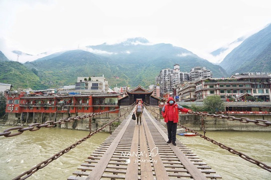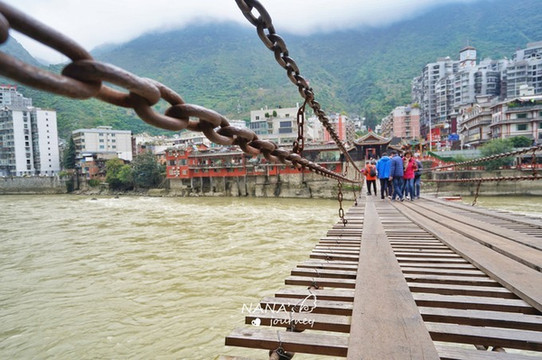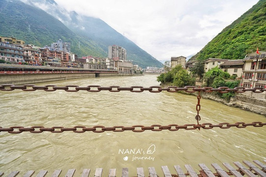 在泸定桥上静看大渡河两岸的泸定市貌,以及湍急的大渡河。