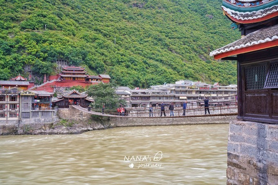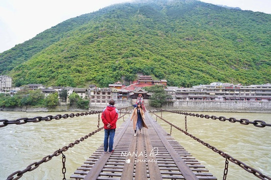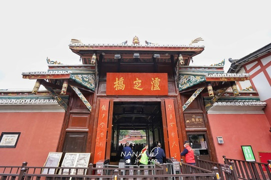泸定桥位于县城最中心,旁边的观景台能从侧面欣赏到泸定桥的全貌,急流勇进的大渡河水,不断摇晃着的泸定桥,对岸依着山坡而建的庙宇。