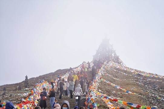 折多山顶的观景台——折多山观雪台,到了这里,才彻底感受到川藏线的热闹,人山人海,很多人手拿氧气瓶,艰难地往高处爬。四处已经迷雾四起了,看着天还蓝,还是想挑战一下。