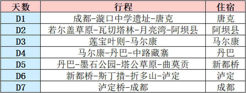 我们这次的行程主要是走 川西 的经典线路,但把北线和常规环线结合在了一起,希望能去到更多种不同风景的地方,从草原到奇石到雪山到民族风情,玩的时间加上行程基本保持在每天8点出发到晚上9点前吃完晚饭,还是比较妥当的。