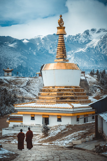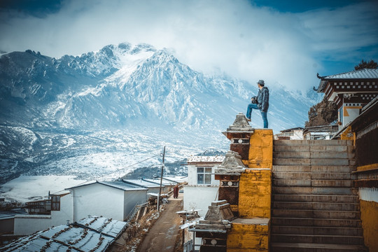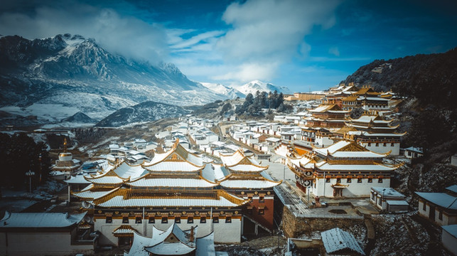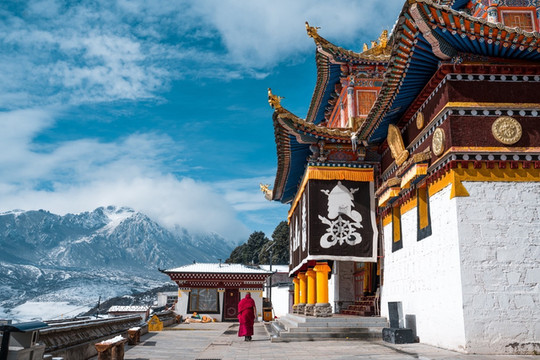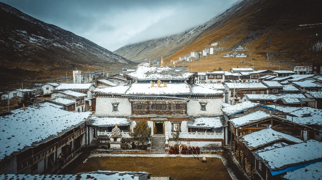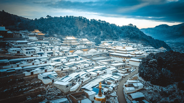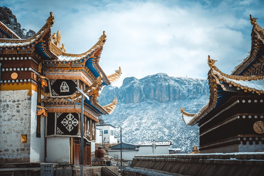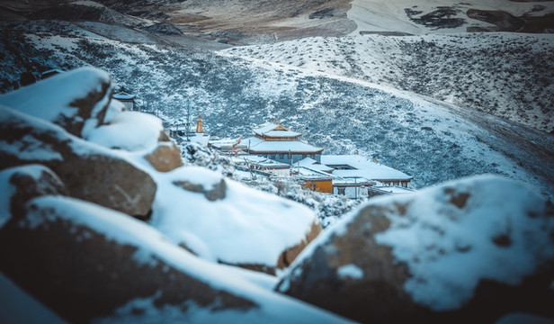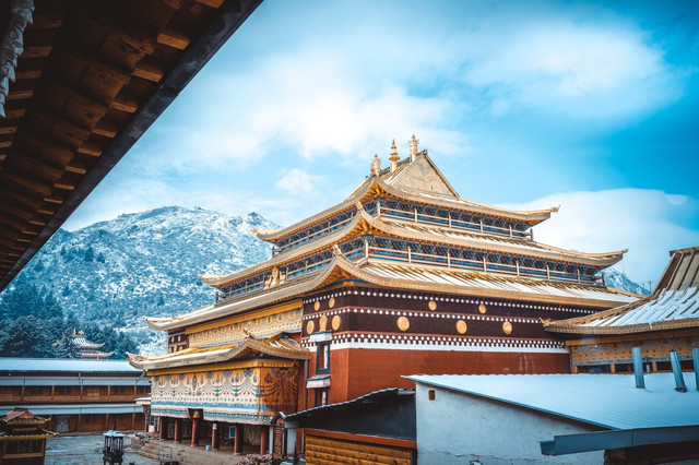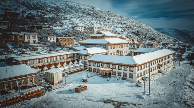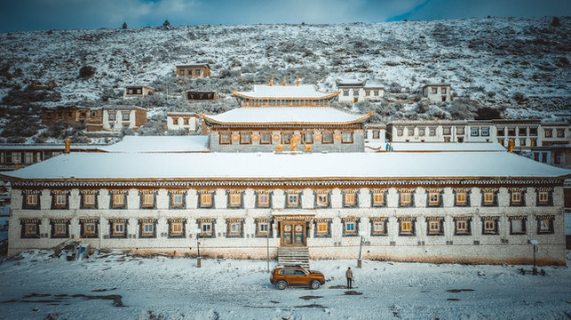 我们也才得以把车开到曲木寺的大门口,欣赏这座如同神仙宫殿般的雪中城堡。