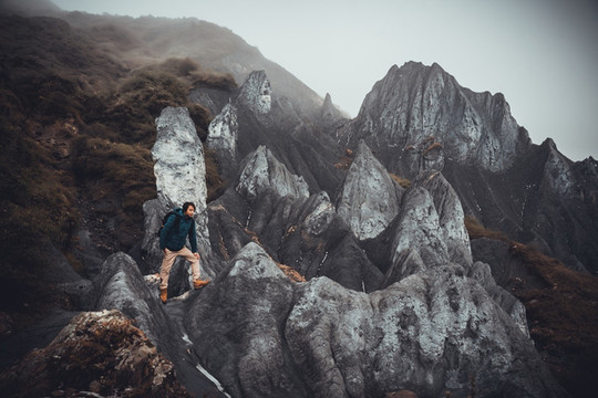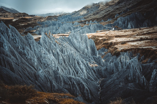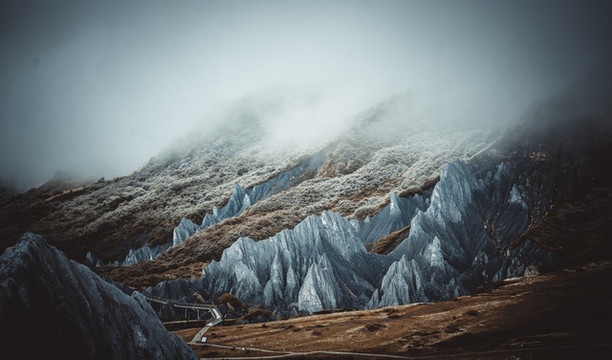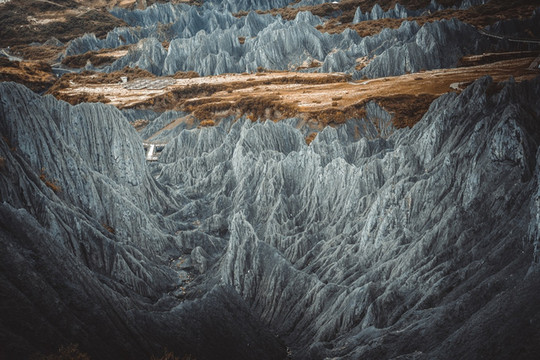 远看像煤灰,近看似墨粉。这种岩石较为软弱又含钙质,经过天然的氧化之后会在不同的季节呈现不同的颜色,甚至在一天之中也是呈多种颜色。阴雨天的时候山体颜色更深,云雾缭绕间颇具神秘感。