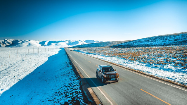随着高度的爬升,路上的积雪越来越多,我们也把驾驶模式切换成了「雪地模式」,这样可以保证车辆拥有更平稳、更温柔的扭矩输出,减小在光滑的雪地上轮胎打滑的几率。