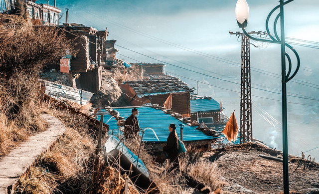 从村口处开车进入,首先到达的是山下的东洼村,这里有一块大石名叫大石门,大石门旁边的小山坡处便是适合拍照的第一个地点。在这里可以仰拍村庄沿山而建的美景,村子后面被峭壁包裹,而村顶最高处则是一个藏传佛教的寺院,景色颇为奇幻美丽。