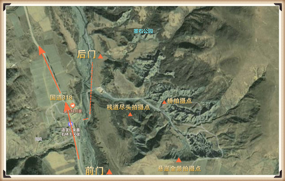 墨石公园拍照点:最佳的拍照点有三个,如图所示,悬崖全景拍摄点,栈道尽头拍摄点和桥拍摄点,具体取景可在下文寻找。