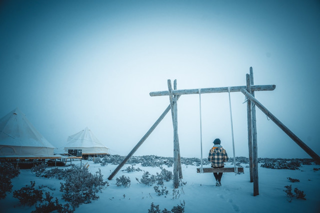 晚上做梦都梦到天亮时山顶放晴,贡嘎在朝霞里发着金光,可梦终归只是梦,现实教做人,第二天一早起来,雾气更是嚣张得笼罩了整个山顶,而阿ken一个人悠闲的在雾中荡着秋千......