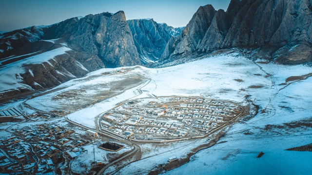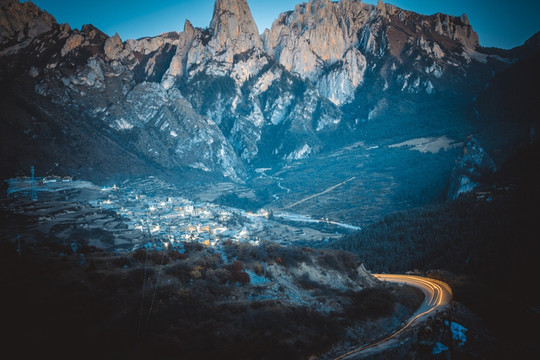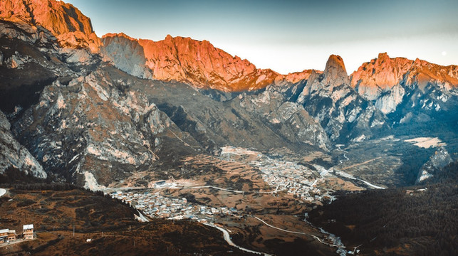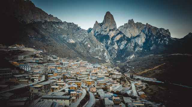 继续往上,经过达日村后有一块视野开阔的观景台,这里便是俯拍全村的最佳地点。可以看到整个村庄和后面奇幻岩壁的全貌,所有的房屋都是古老的木制房顶和土墙建筑,显得古朴安详,在崖壁包裹之下构成美丽的画卷。