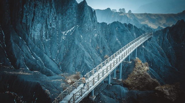 栈道从墨山间穿过,因为刚下过雪又融化,所以冰凉,灰黑的水沿着山谷往下流,如同一条墨水汇成的小河。