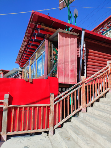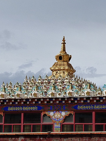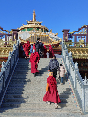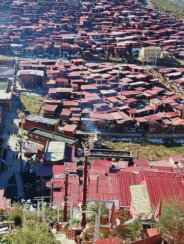 次日阳光朗照,天空湛蓝,旅游专车把我们直接送到色达佛学院的山顶。走在山顶的大街上,阿李被眼前的红色海洋震撼到了:山谷底是金色的寺庙,金色寺庙的四周全都是密密麻麻的绛红色的木房子,这些红房子沿着山坡向上蔓延,一直蔓延到山顶,蔓延到我们的脚下。山顶建有一座三层高的坛城,在阳光下的照耀下金光闪闪,无数的僧人和信众正围着金色转经筒转经。阿李先登上坛城,跟着人流参观了一圈,然后再走下来,沿着红房子之间的长街走向山谷底,走进红房子海洋。