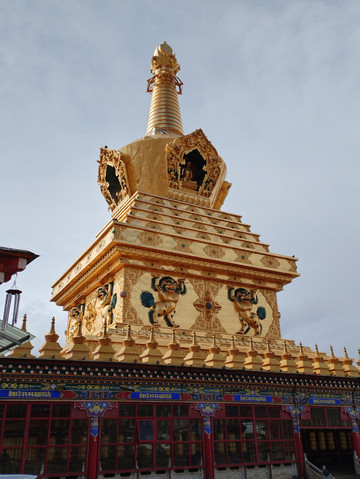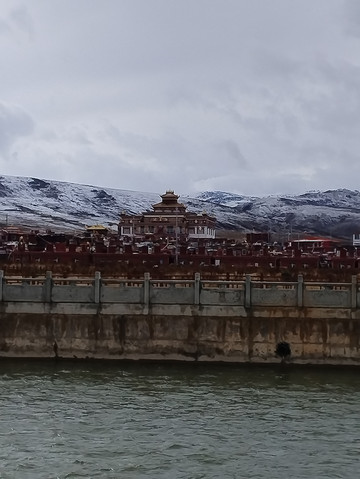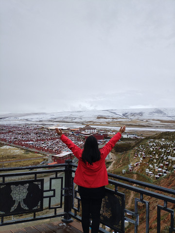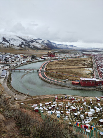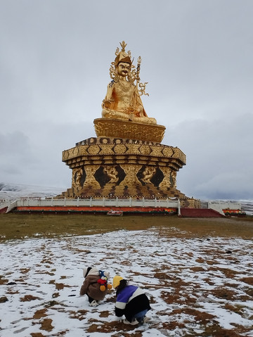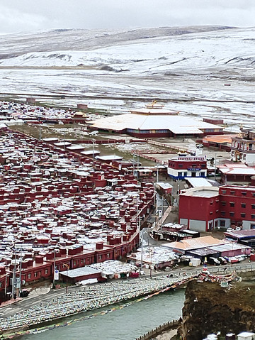 去亚青寺不需要买票,也不需要预约,游客可以自由参观,也没有时间限制。我们是中午到达那里的。阿李先沿着栈道登上觉姆区对面的一座山岗,那里可以俯瞰四周风光。山上比较开阔,还有积雪,草坪中矗立着一座金碧辉煌的塑像——藏传佛教宁玛派的创始人莲花生大士的坐像。莲花生大士向南而坐,面对的是金灿灿的法会广场、佛塔、寺院及红色的扎巴住宿区。他右手所指的方向,是陡峭的山崖,山崖下是玉带般的昌曲河,昌曲河的对岸就是觉姆区,上面都是密密麻麻的红房子——房顶上有雪,和远处白雪覆盖的草原遥相呼应。