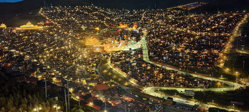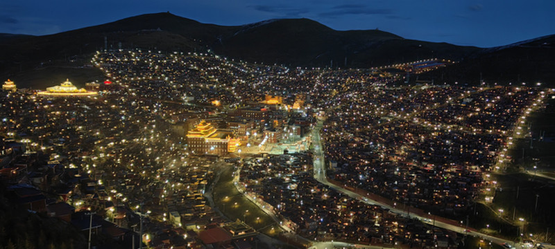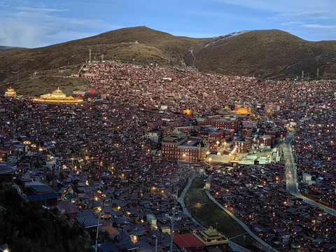 我们到色达时已是上午十一点多,领队马上带领我们去买票。而当天的车票只有下午三点半的三张,余下的都是次日八点半的。于是我们团只有三个人有机会在当天下午去色达佛学院,其他人都只能等到第二天早上去了。这三位团友到了色达佛学院后,一直游玩到天黑,在山顶观景台上拍下了色达佛学院夜幕下的全景图,并发在群里,让我们有幸看到了色达佛学院宏伟壮观的夜景。而他们因为游玩时间超过了一个小时,没有旅游专车可坐,只能挤上当地的公交车辗转回到酒店。