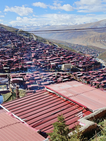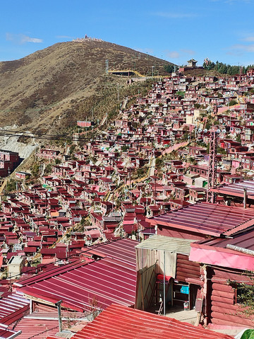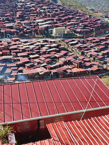 走到半山腰时,规定的游玩时间快到了,阿李只能停下了脚步。谷底那闪着金光的寺庙只能远远眺望一下了。等阿李坐上旅游专车时,时间距我们到达这里刚好过去了一个小时。旅游专车载着我们穿过色达佛学院,穿过这些红房子。我们看着这片红色海洋离我们越来越近,然后又越来越远,直至消失。