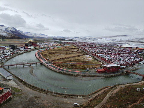 亚青寺由佛教大师阿秋仁波切于1985年创办,是女修行者的圣地,是世界上最大的尼姑寺庙之一。它建在海拔四千米的昌台大草原上,昌曲河穿寺而过,将寺院一分为二,一边是扎巴(男修行者)区,另一边是觉姆(女修行者)区。昌曲河并不是笔直穿过,而是拐了一个很大的弯,像画了一个半圆似的把觉姆区揽在自己怀里,让觉姆区成了一个半岛,只能靠桥梁同扎巴区相连。因此,觉姆区成了现实世界中的女儿国。