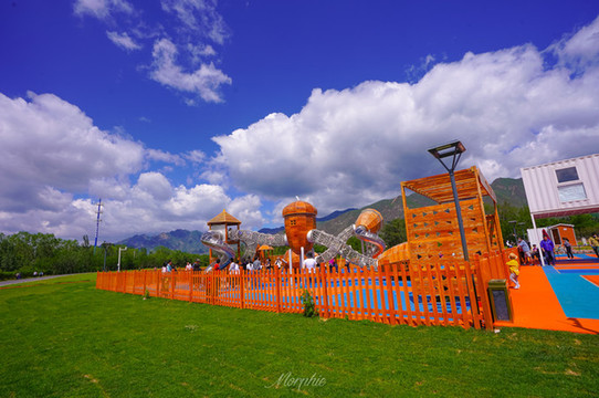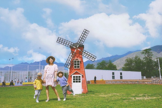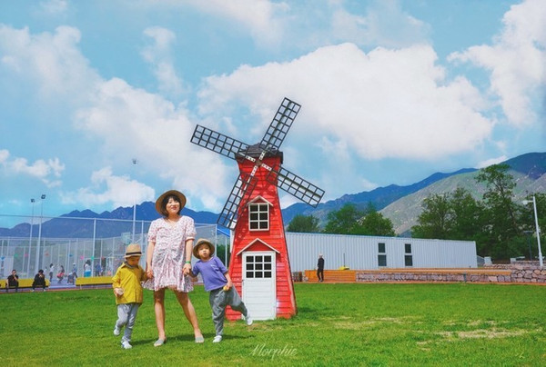 4、室外游乐场的草坪上,砖红色的迷你风车静静立在山峦起伏的环抱之下,那天的云朵就像新海诚电影里的天空,漫画里的场景。真的,这里可以随便拍,太出片了。