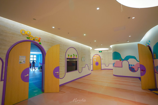 2、穿过酒店一层的连廊,可以前往2层楼的“嬉乐场”。玻璃幕墙与白色骨架搭成的连廊内部,在彩色地板上随便一站就很有ins风,也是拍照的好机位。