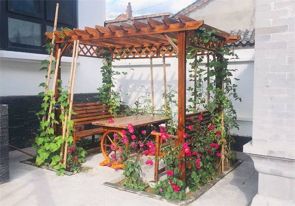 院子里还有凉亭,周围种植了翠竹、欧月、绣球、玉簪、矾根、豆角、南瓜、佛手、小葱,为您带来乡野情趣,如果正值瓜果成熟,您可以适当摘取享用。