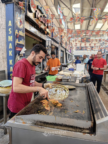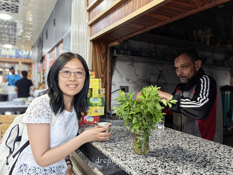 时常看到有人在路边喝咖啡,小小的一杯,挂壁很严重,确定这就是埃及当地的咖啡喝法。但是一直没空闲下来找个店喝一杯,市场里刚好看到一家咖啡店,在等餐的间隙去买一杯。极细研磨,咖啡粉加水在沙里加热,不滤渣。第一口像薄型的芝麻糊沙沙的口感,沉淀一会儿口感会清爽些,最后杯底留下泥一样的咖啡渣,很特别。