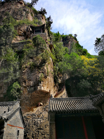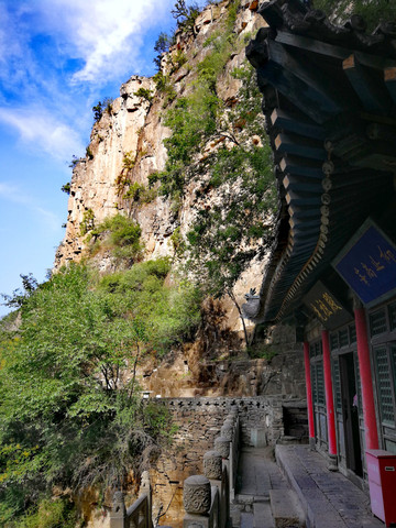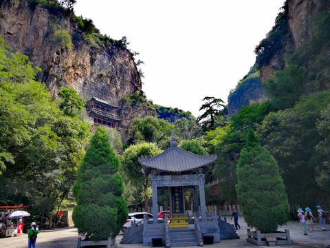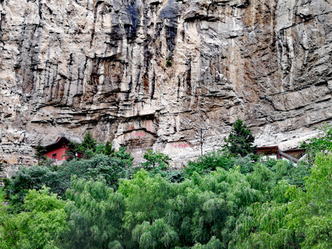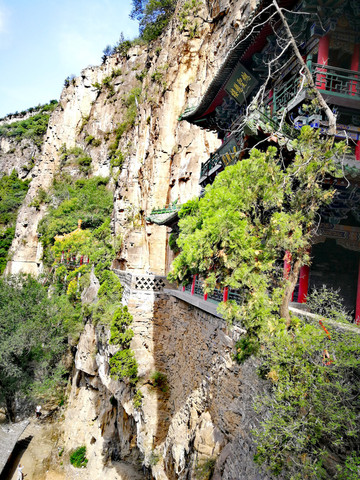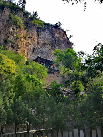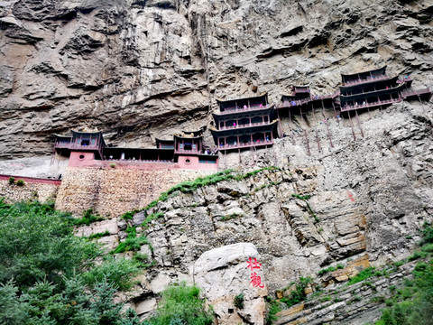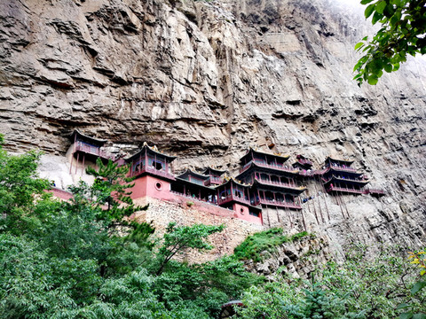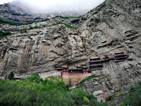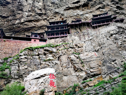 恒山悬空寺始建于北魏太和十五年(公元491年),金、明、清均有重修,现为明清建筑风格,是国家级重点文物保护单位。整个建筑具有险、奇、巧的特点,共有楼阁40余间,从低到高三层迭起,最高处三教殿距峡谷深处的高度曾为90余米,由于1500余年峡谷河床沙石沉积,现高度仅为45米,但站在三教殿仍有身临险境的感觉。这座纯木构建筑,瞩目远望,仿佛是一幅玲珑剔透的浮雕,大有凌空欲飞之势,鬼斧神工,令人叹为观止。民间道:"悬空寺,半天高,三尺马尾空中吊",大诗人李白则用"危楼高百尺,手可摘星辰,不敢高声语,恐惊天上人"来形容之。