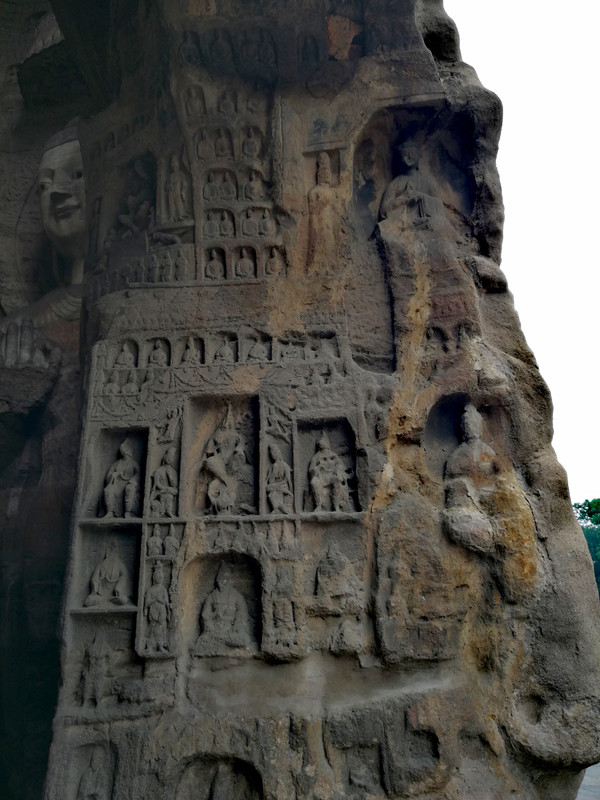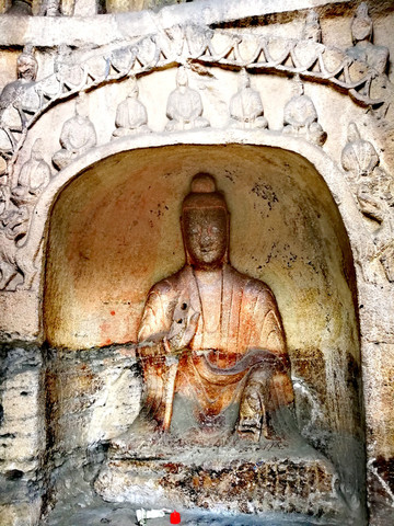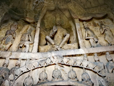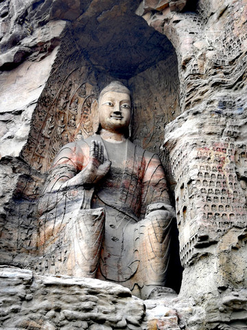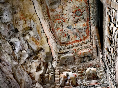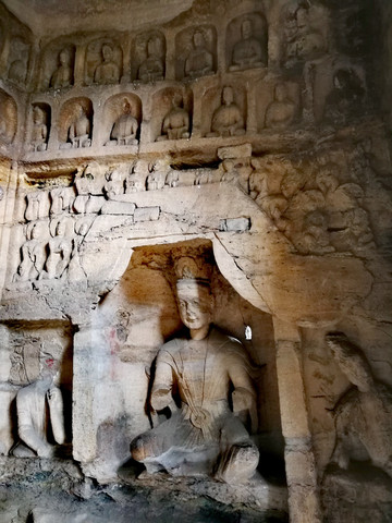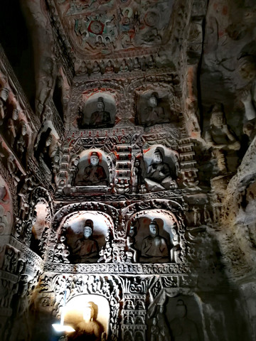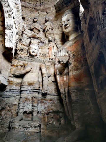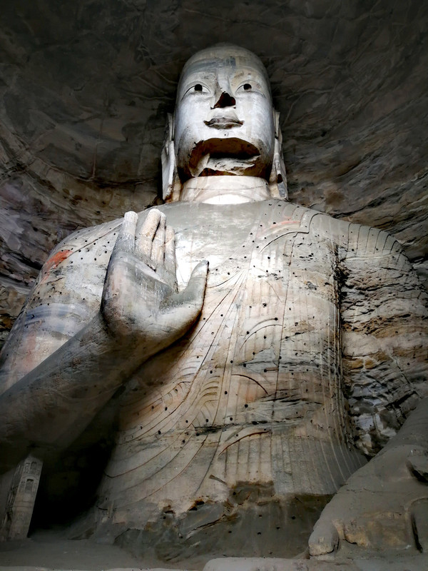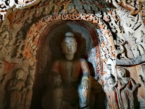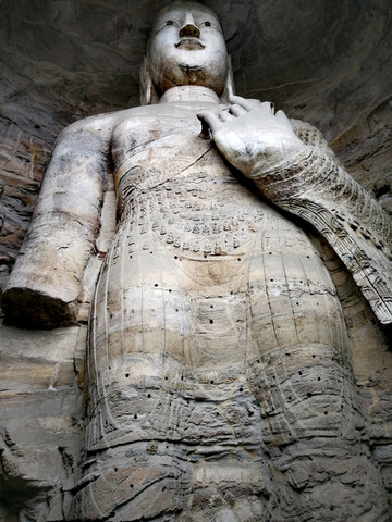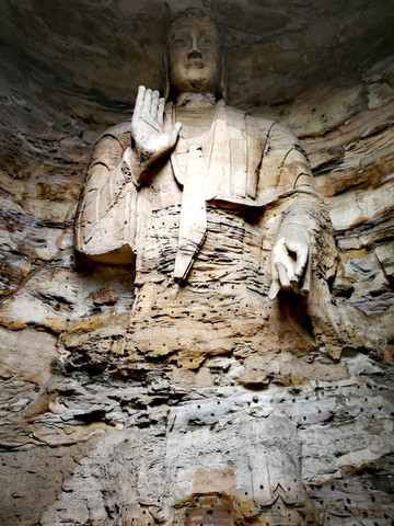 昙曜在大同云冈主持开凿最初的五窟佛像,以北魏开国以来的五位皇帝仪容为蓝本,这也显示佛教充分迎合了统治者的需要。这五窟就是今天的云冈第16-20窟,第16窟佛像酷肖支持昙曜开凿石窟的文成帝,而第20窟最为典型的露天大佛则是依照北魏开国皇帝道武帝形象刻制。从此之后,北魏统治者以及鲜卑贵族继续开凿,一直到北魏孝文帝迁都洛阳后才基本停工——北魏统治者到洛阳后又在洛阳开凿龙门石窟,说起来云冈与龙门两石窟,算是“亲兄弟”了。