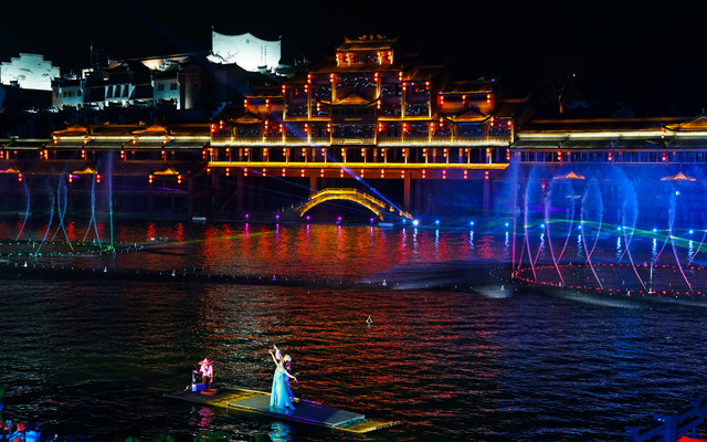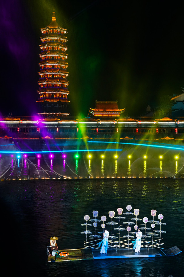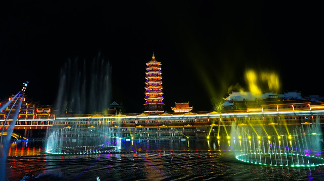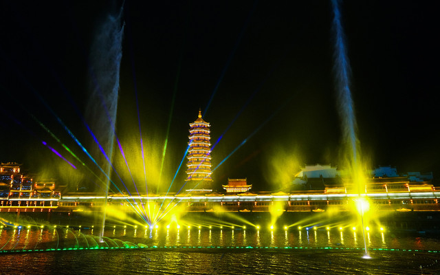 在夜色之中,金碧辉煌的仿古建筑群为背景,变幻多彩的灯光、跌宕起伏的水幕、与绚烂夺目的烟花相互映衬,再加上优美的歌舞表演和刺激的水上飞行,古今交融、中西合璧,让人目不暇接,值得打卡哦。