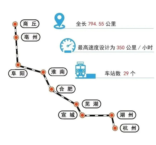 商合杭高铁实际修建路段是字河南商丘至安徽合肥至浙江湖州,利用宁杭高铁湖州至杭州段引入杭州铁路枢纽,而在湖州站的接入方式是外包宁杭场,通过车站渡线与宁杭高铁贯通,真正实现了全面的融合。