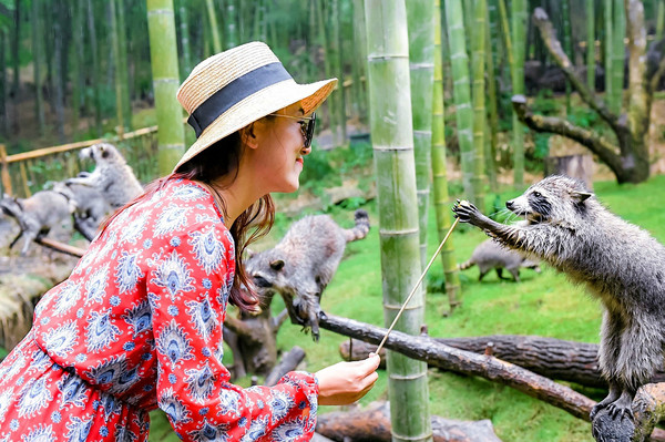 再往里面走,很多小动物因为下雨躲进了自己的小窝里面没有能够看到,只有一群可爱的小浣熊还在雨中热情营业。它们看到有游客过来,赶忙起来攀上枝丫,热情地迎接着我们。